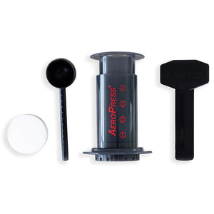 Wir bieten die AeroPress im Set inkl. 100 Filtern mit Behälter, Meßlöffel und Rührstab an.