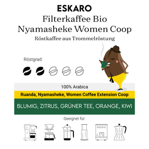 Der Filterkaffee Bio Nyamasheke ist ein komplexer Kaffee mit ausgewogenen blumigen Aromen von Zitrus, grünem Tee, Orange, Kiwi und Mandarine.